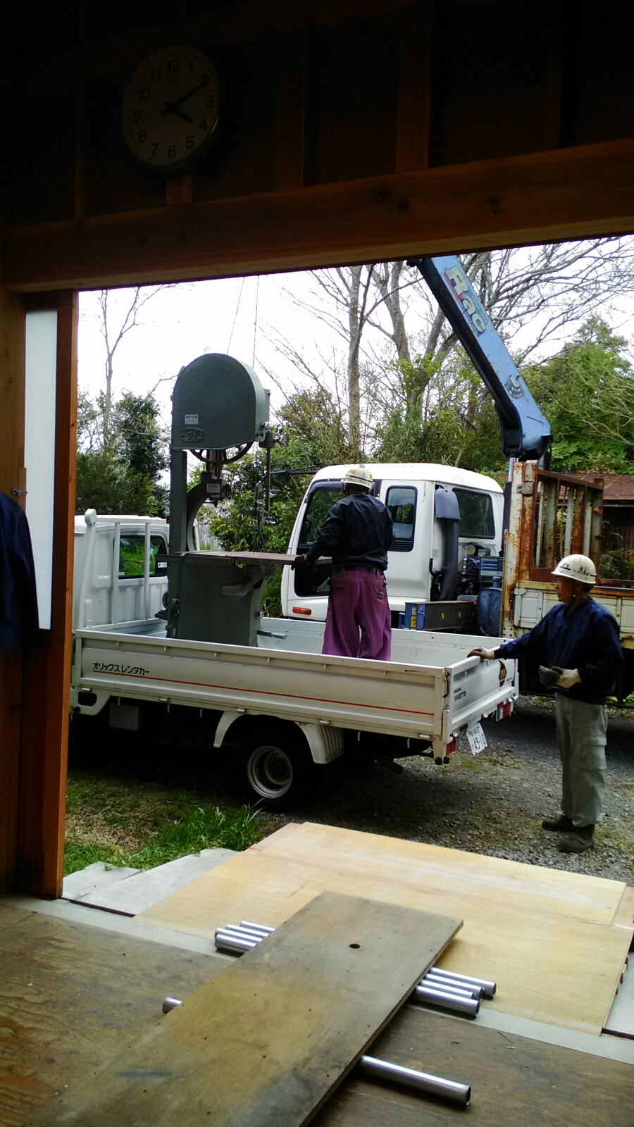 工房に到着。近所の鉄筋屋さんにユニックで下ろしてもらい無事運び込めました。
