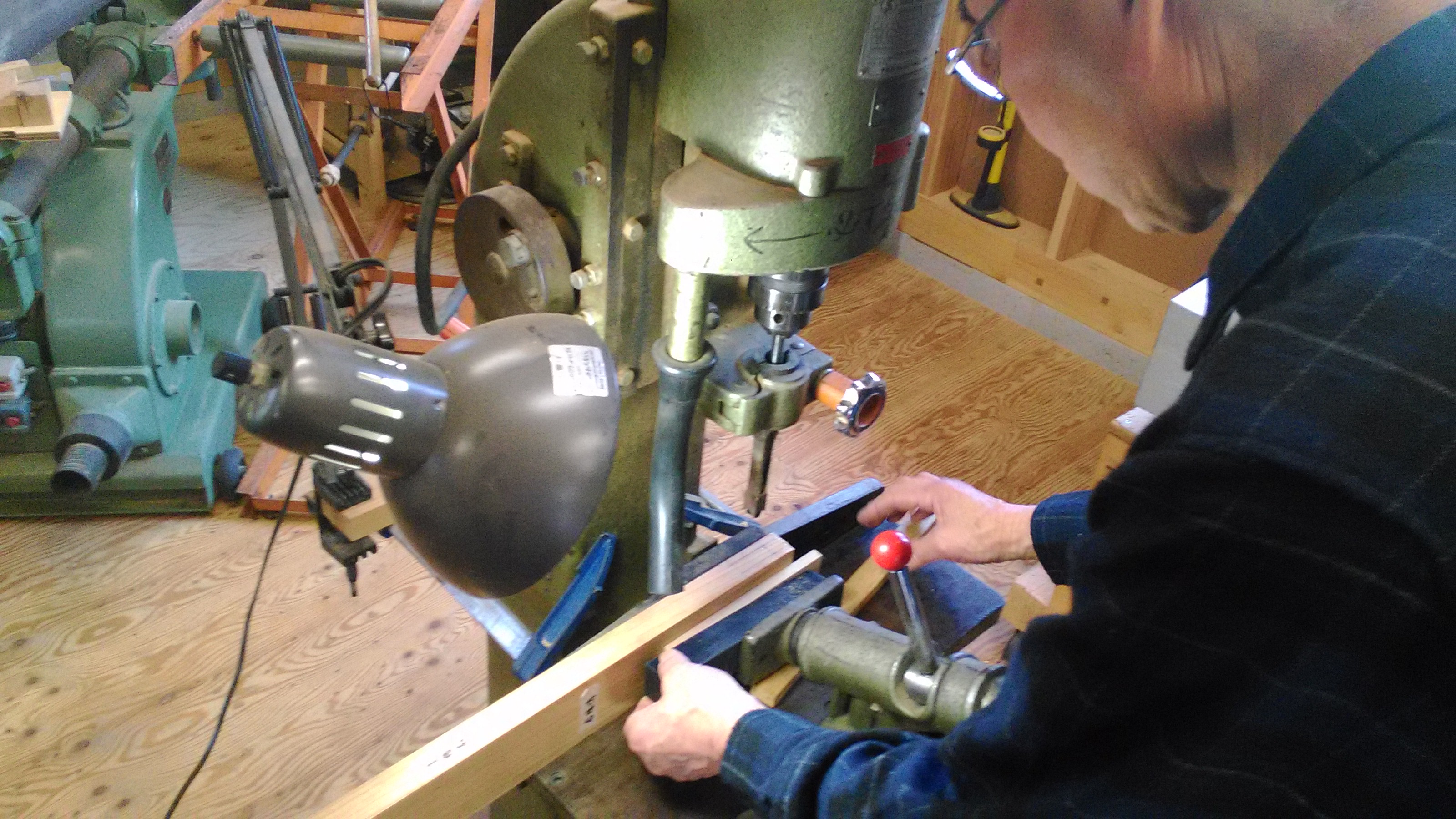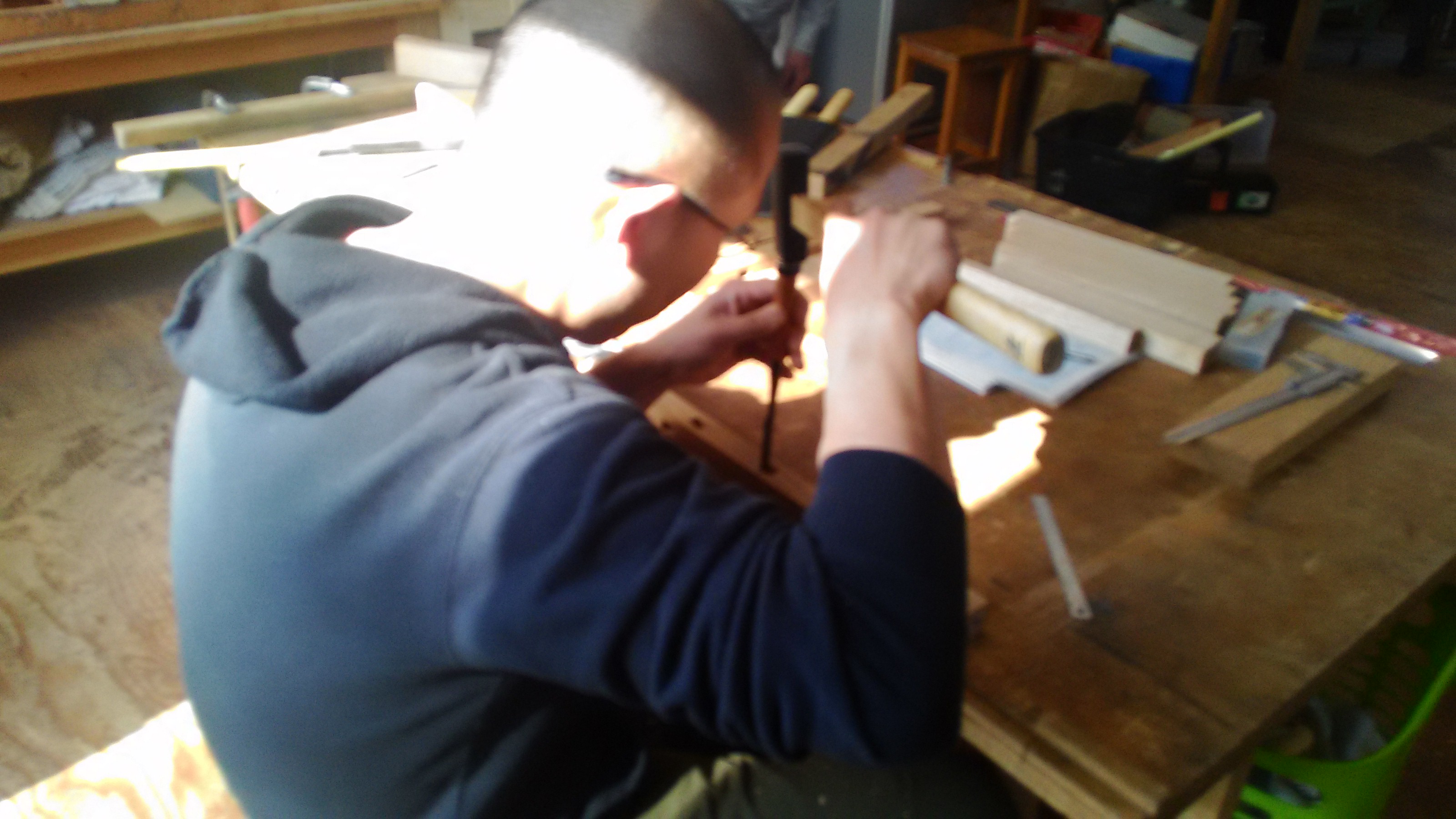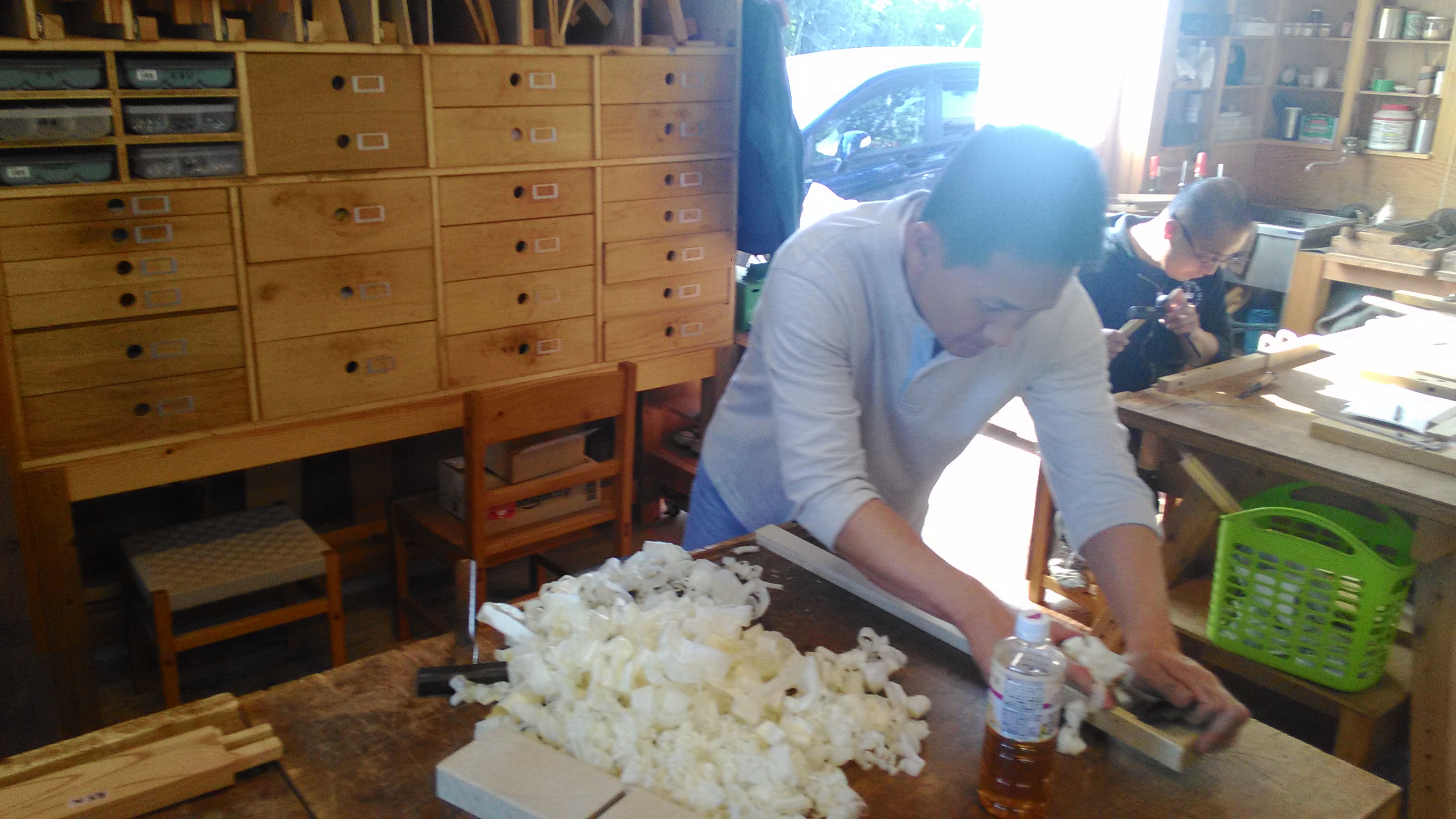 椅子の脚の鉋がけ。途中から2方向に曲がっているので、反り鉋などを駆使してけずっています。