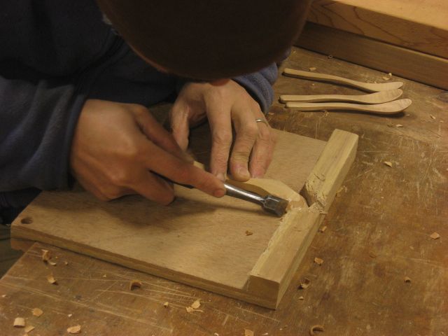スプーンのくぼみを丸鑿で削っています。