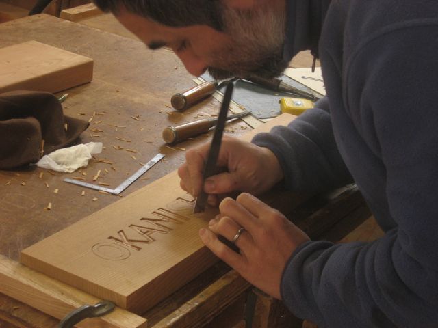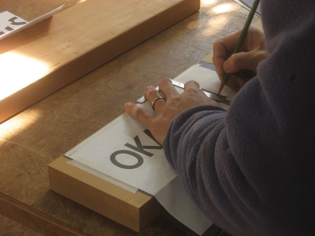 パソコンのから拡大したフォントをプリンタから出し、カーボン紙を挟んで木に写し取ります。