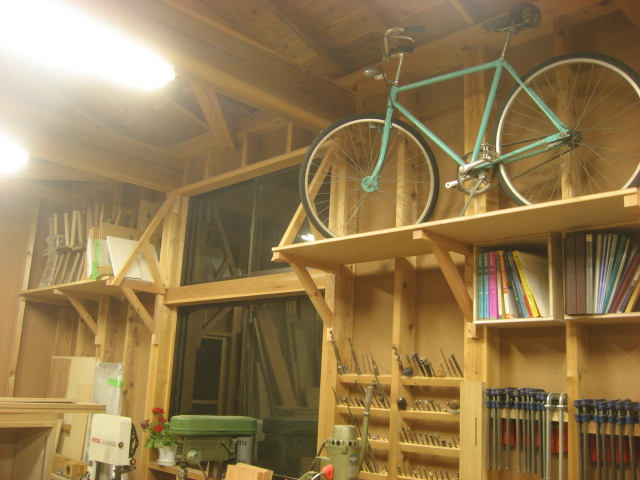 荷物用に作った棚ですが、自転車を置いてみたらしっくりはまっているので、しばらくはこのまま置いておこうと思います。
