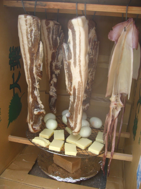 そして薫煙へ。即席の段ボール薫煙庫です。