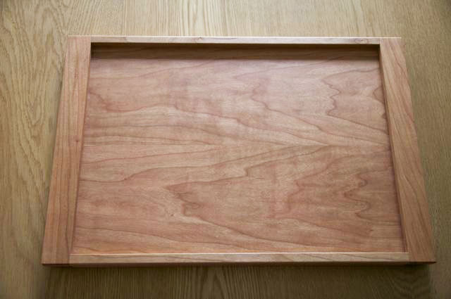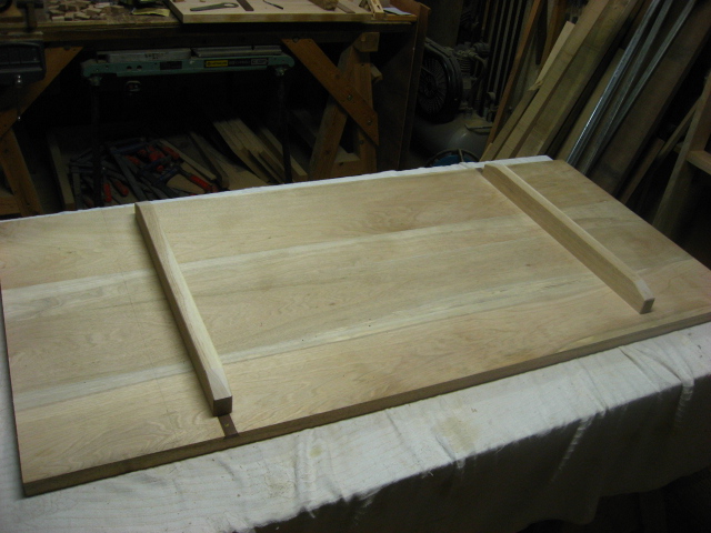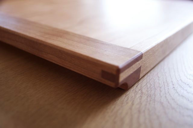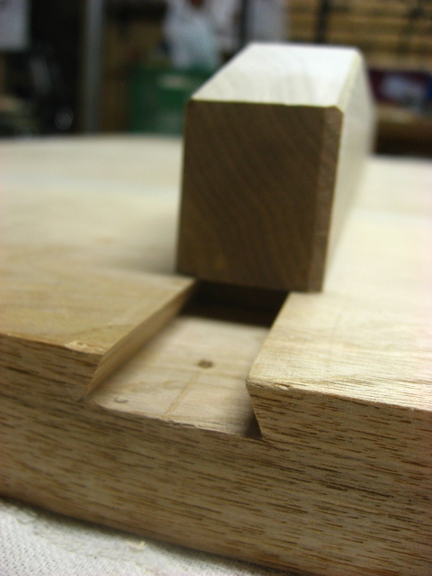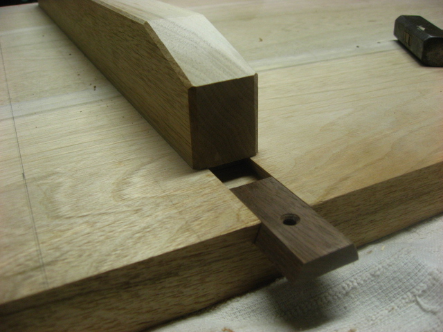 天板の裏側に蟻型の溝を奥行き方向に入れ、その溝に合うように加工した桟木をスライドさせながら叩き込んで入れます。