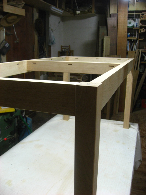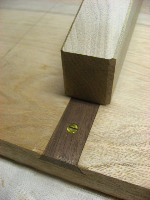 脚の四隅の幕板の部分に補強の隅木を入れます。脚に貫や桟を入れない場合特に必要です。(写真はまだ取り付けていません。)