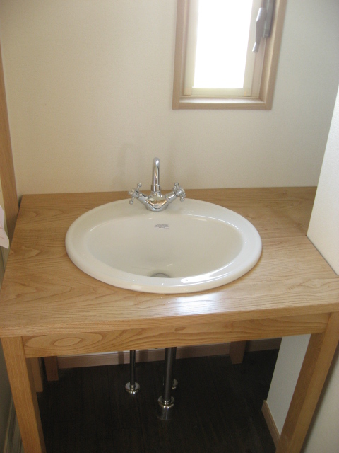 その時はカメラを忘れて、後日また撮影しに伺ったらもう水洗と排水パイプが設置されていました。洗面台の材料は水に強いクリの木で製作しました。奥の窪んだ部分に同じクリの木で作った棚板が入る予定です。