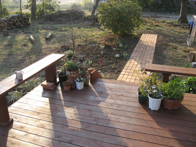 ウッドデッキの階段へと続くレンガの道です。
